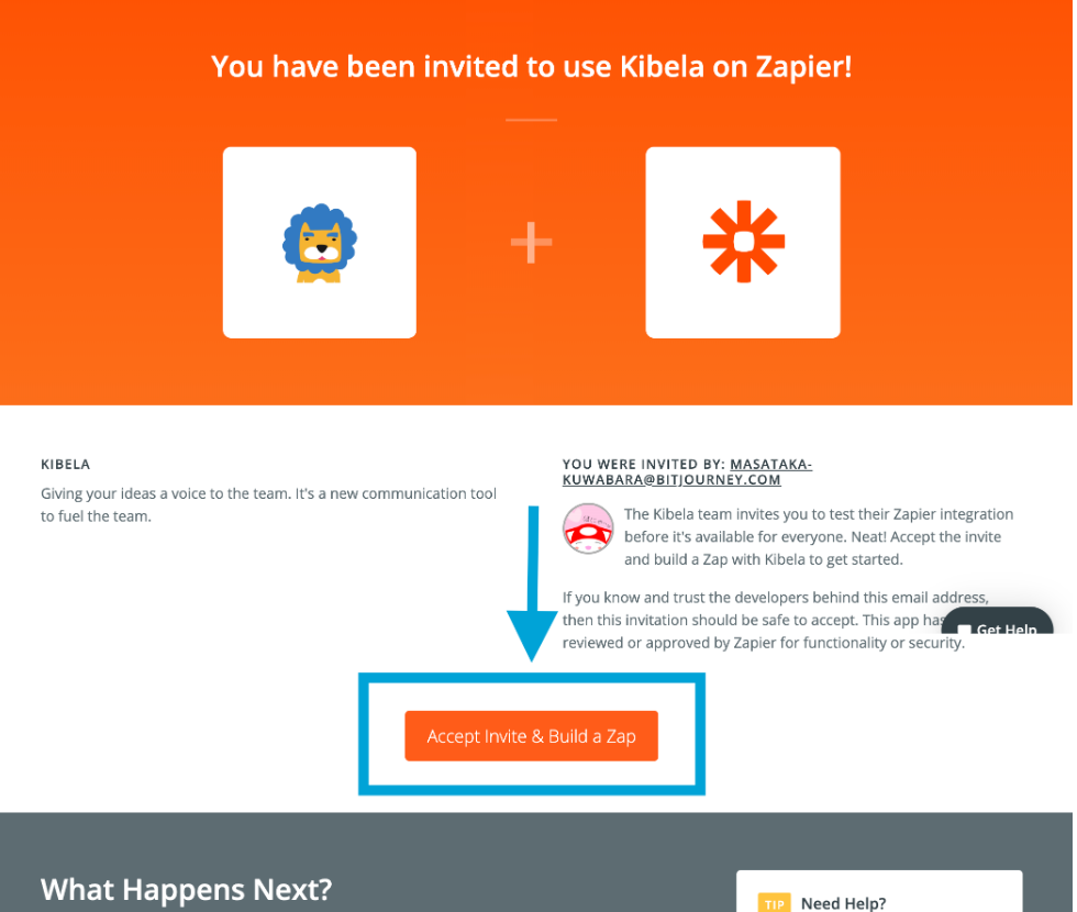 リンク先で下記画面が表示されますので、「Accept Invite&Build a Zap」をクリックしてください。