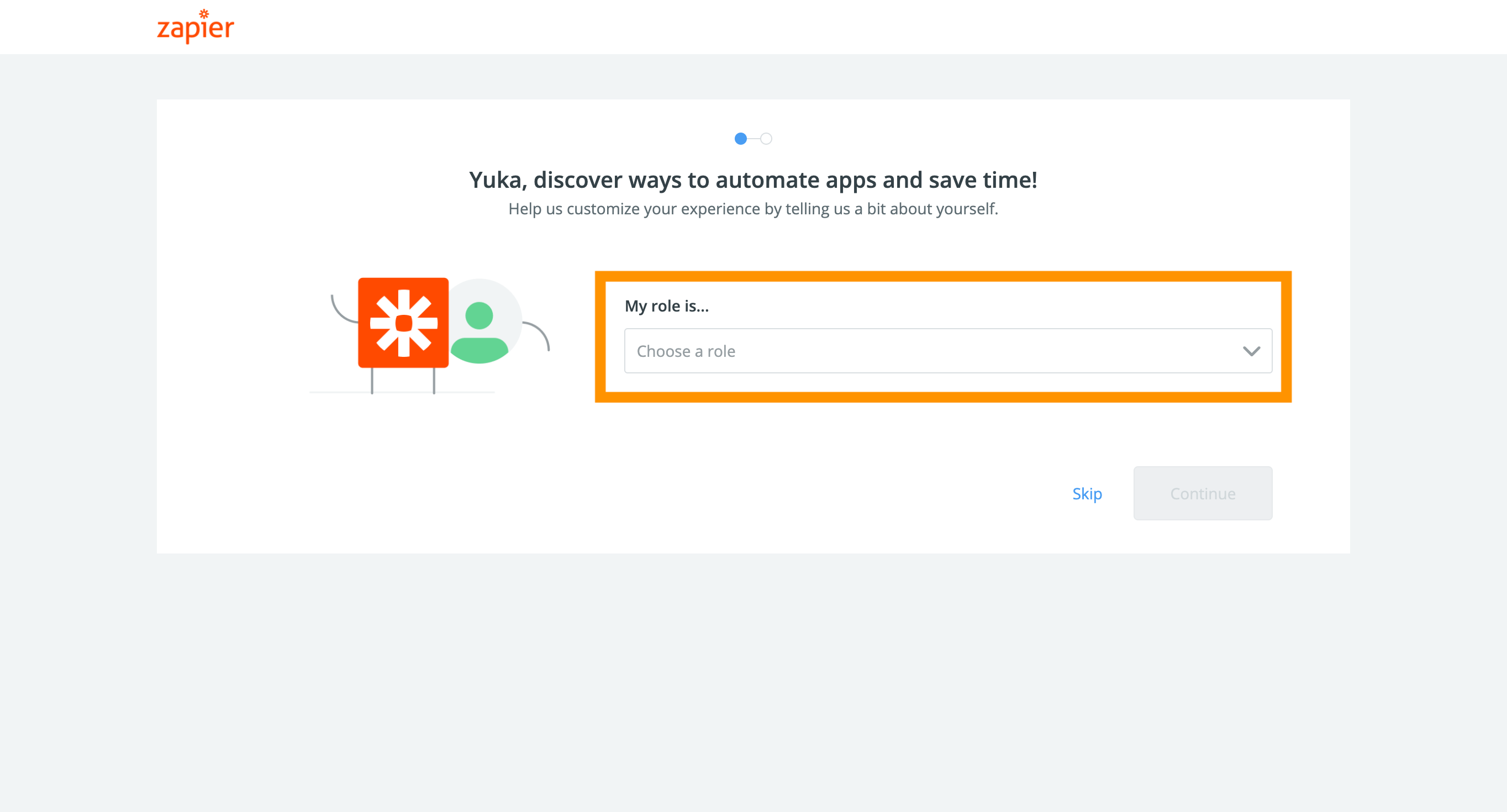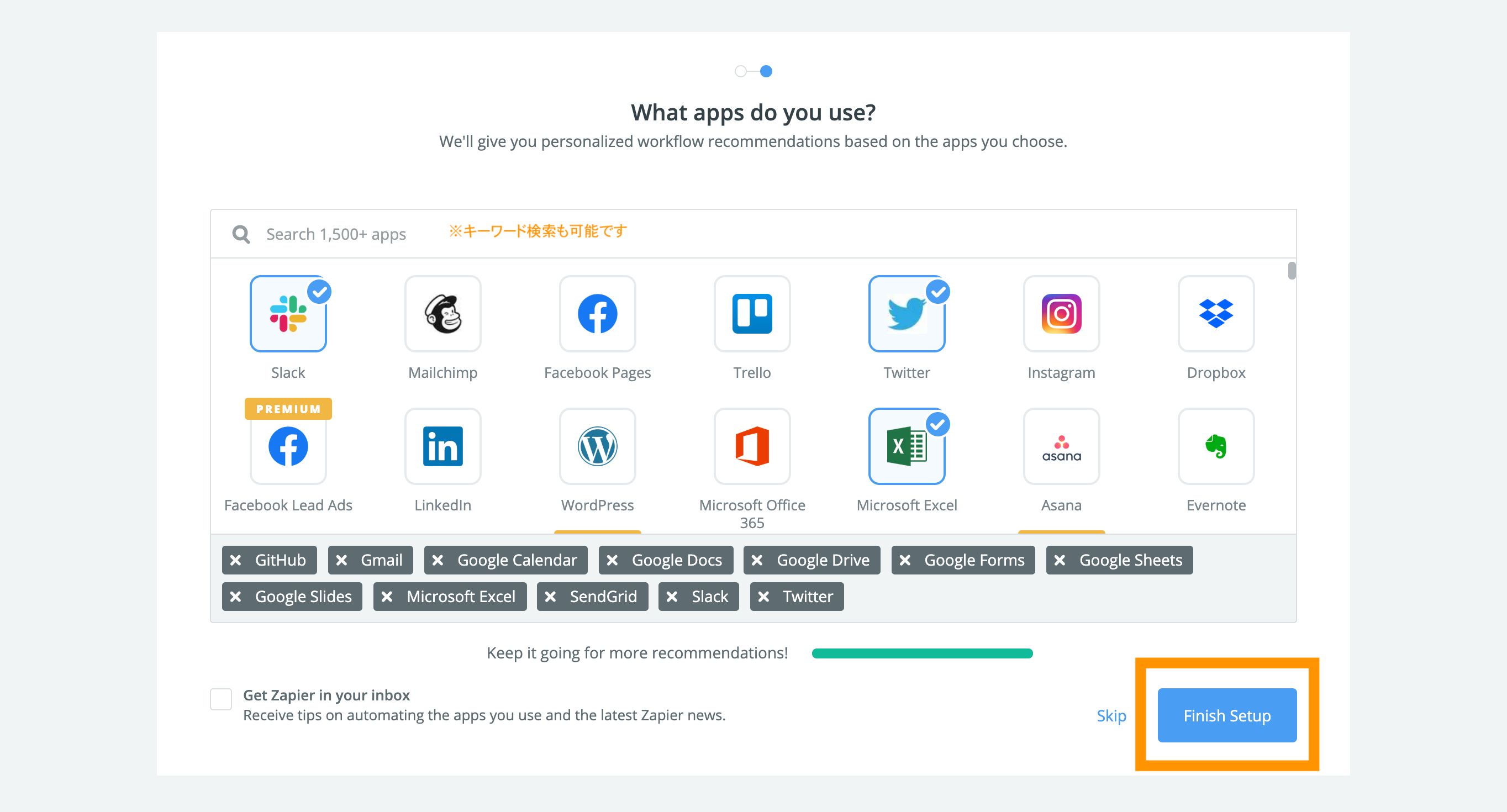 4. 普段お使いのアプリを選択し【Finish Setup】をクリック。ここで選択されたアプリに基づいて、パーソナライズされたワークフローの推奨事項を提供してくれるので、なるべくご利用のアプリを選択いただくことをおすすめします。 (ここではKibelaアプリは表示されません)